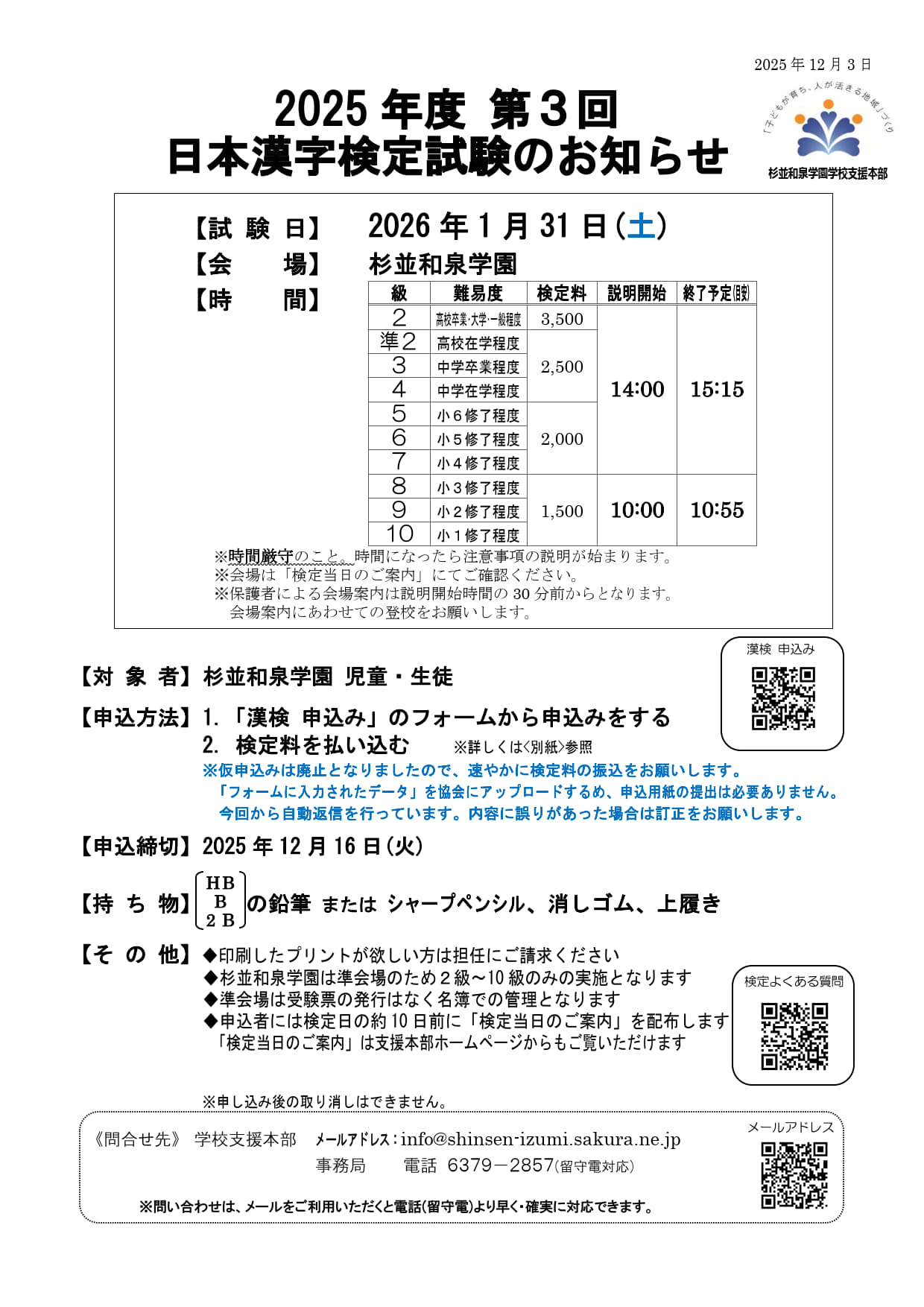 2025年度 第3回 日本漢字検定試験のお知らせ